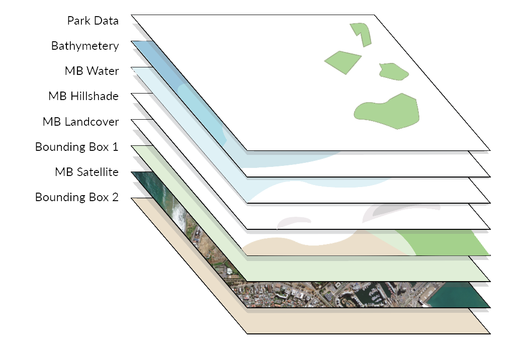 To achieve the fade out of the terrain layers, the flat layer above the satellite imagery gets stronger in opacity as the user zooms in. To help the color flatten, the sat imagery also gets completely desaturated. There are still a few jumps zooming in where the color difference shifts from the yellowish-green to a more aqua-green, but overall the experience is fluid enough where I don’t believe that’ll stick out.