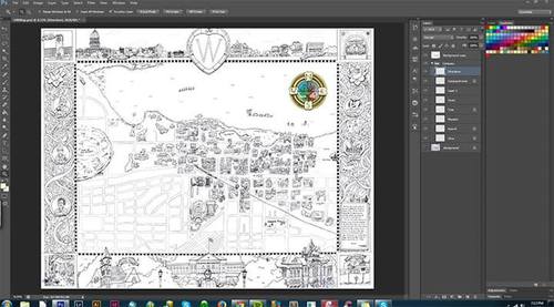 In order to do the coloring I re-scanned the map, opened it in photoshop, and immediately put the scanned copy on the top layer. Setting that layer to Multiply allows you to treat it as a coloring book.