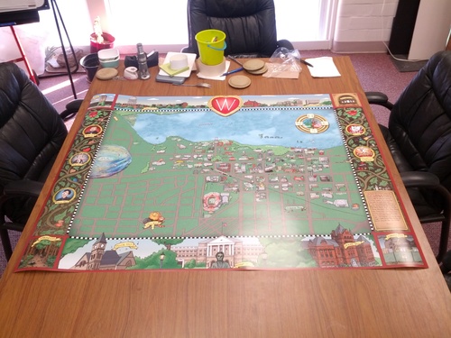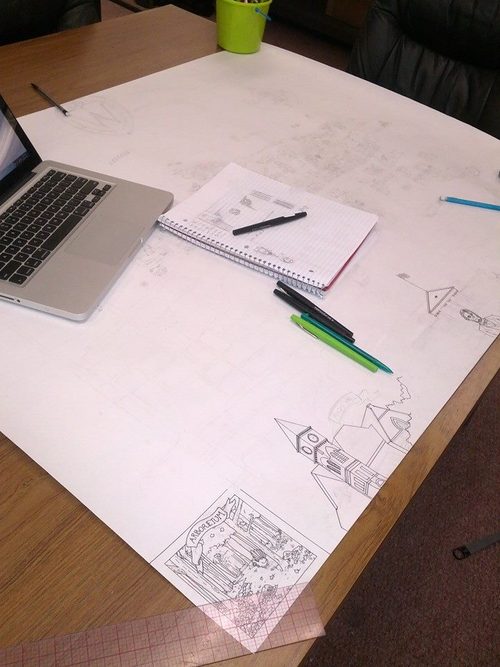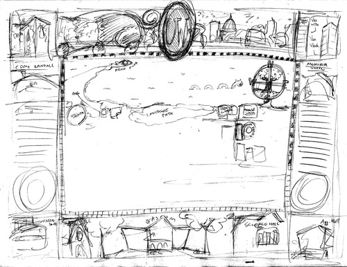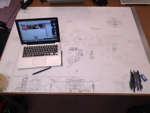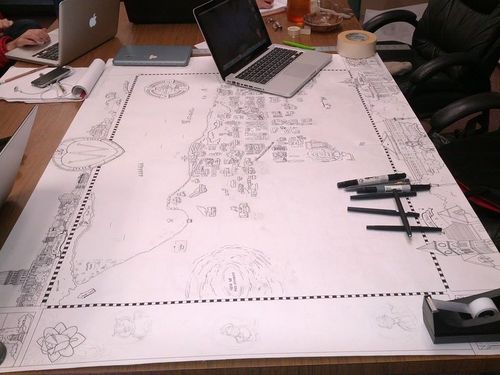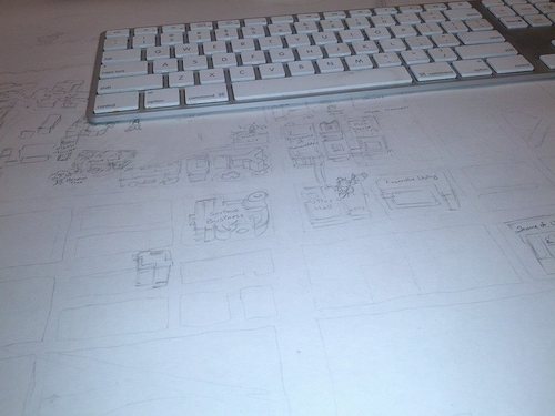 The project initially began by renting a projector and trying desperately to tape the 4’ x 3’ paper securely to the wall. Then, I projected google maps over the center and roughly sketched in all the streets. I in no way desired to measure out distances of streets, nor did I trust my hand to just figure it out as I went along. I still managed to goof up a few areas, but people have been kind to not point them out.